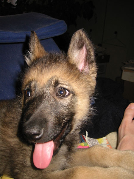 Baby is growing fast and looks a bit different each time I see her. Here she looks like a German shepherd, Rin Tin Tin's little sister? She is still a bit shy, but very alert and loves to play in water. Geoff still carries her in a backpack when he rides his bike, but she is getting better at keeping up. Those stubby little puppy legs are getting longer. |