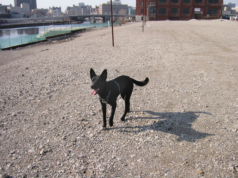 When the dogs come to visit, we set Ling Ling's food dish up right away. Buddy is checking for any crumbs of kibble he might find. |