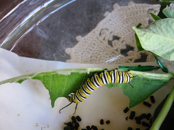 September 1, 2004 - the smaller of the two caterpillars (in the fish bowl) is still content to munch on milkweed leaves. The larger one (seen through the net on the top of the container) has started crawling all over the inside of the container and ignoring his food. This is the first I have seen one of them leave the milkweed leaves. |