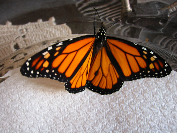 A few hours later, it too emerges as an adult. If you have looked around on this site or know me, you will remember that I live with Ling Ling, a Siamese cat. One would wonder what the cat thought of all this activity. He didn't notice anything until after I released the first two butterflies and the third was strengthening his wings (850 KB QuickTime movie). |